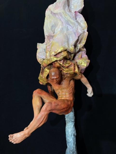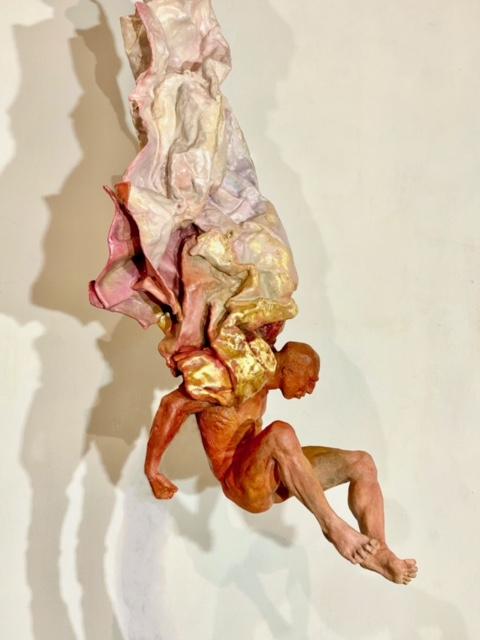 Proton VI is an exploration of the feeling of giving birth, could be giving birth to an idea, a belief, a creation…. I decided on the visceral red and orange colouring of the bronze to accentuate the experience of birth. Inspired by Quantum physics, Particle and Wave theory; “Playing in the field” looking at fundamentals; energy moving between a fine vibration (wave) to a coarse vibration (particle). From Spirit to Physical and back. Proton VI emerges as a human being born from the etheric nebulousness of the quantum field of possibilities.
